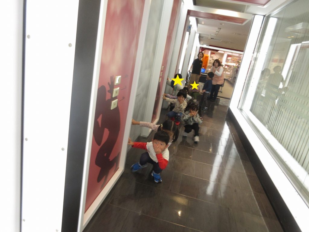 身体を低くしてかがんで歩く練習 をしました