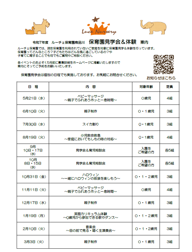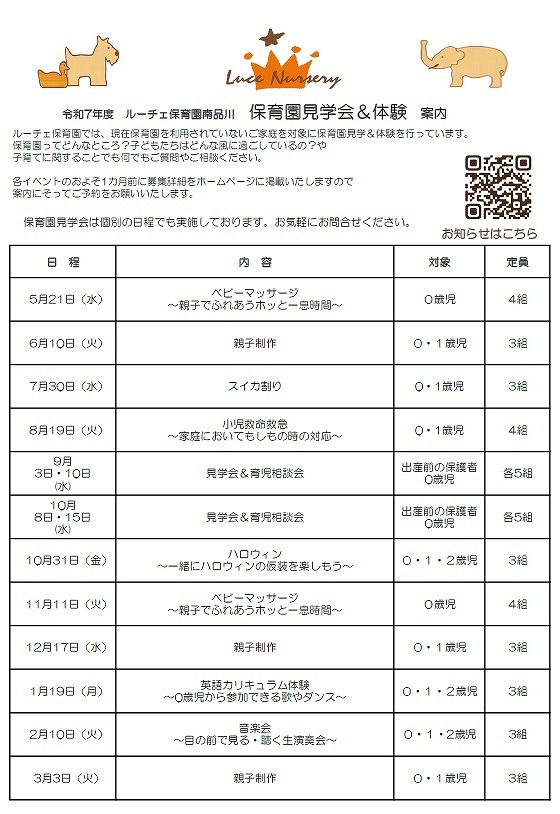 令和7年度途中入園や令和8年4月入園をお考えで、見学ご希望の方は下記スケジュールをご参考ください。見学のみでしたら個別の日程対応も可能ですのでお気軽にお問合せください。
