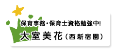 笑顔、心配り、思いやりが人一倍の大室さん。前職はウエディングプランナーとして活躍していました。今は保育補助や事務として勤務。西新宿園のムードメーカーとしてなくてはならない存在です。私も彼女に会うととても楽しい気持ちになれます。子育て真っ只中で多忙な日々の中「保育学校に行きます!」と夜間も学んでいます。いつも向上心を持って頑張っている姿に心から資格取得を願い、いつも応援していきたいと思っています!